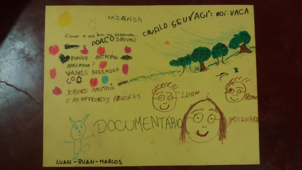 A Pedagogia de Projetos prevê a criação de um roteiro de pesquisa. Nesse caso, a proposta era realizar um produto audiovisual que os educandos iriam definir qual e como. As crianças precisavam responder, para elaborar seu roteiro de pesquisa: O que eu quero fazer (ou que filme eu quero fazer)? Por que eu quero fazer (esse filme)? Como vamos fazer? O que precisamos para fazer? O que desejo aprender com esse projeto? Realizamos essa atividade em formato de cartazes, que foram fotografados e ajudaram muito durante o desenvolvimento das atividades, sendo especialmente útil ao mediador, visto que depois de algumas semanas, o desejo das crianças de fragmentar os grupos e de imergir um no projeto do outro poderia ter dissolvido praticamente todos os grupos, não fosse o registro primeiro do planejamento.